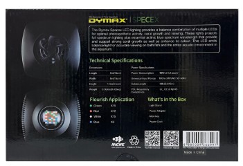 The DYMAX SPECEX LED Lighting provides a balance combination of multiple LEDs for optimal photosynthetic activity, coral growth and viewing. These lights project full spectrum lighting plus essential actinic blue spectrum wavelength that provide and support strong coral growth as well as enhance its colour. This LED also emits balance light for accurate viewing on both fish and the entire aquatic environment in the aquarium. What’s in the Box? Light Stand Power Adapter Allen Key Power Cord Features: 24hr Smart Control Intensity selection Night light option Spectrum control Convective heat exchange design Dimensions: Length: 6 inch / 15cm Width: 6 inch / 15cm Height: 1.4 inch / 3.5cm Weighting 0.436kg Power Specifications: Power consumption: 48W at full power Universal input range: 100 to 240VAC 50-60Hz Cable Length: 10ft (3.048m) PSU Regulatory Compliance: UL, CE & RpHS LEDs: 15x Green, 12x Red, 6x Blue, 15x White