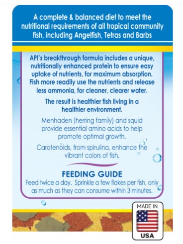 API® TROPICAL FLAKES is designed specifically for tropical community fish such as Angelfish, Tetras, and Barbs, and contains a unique, nutritionally-enhanced protein to ensure easy uptake of nutrients for maximum absorption. Fish more readily use the nutrients in our high-quality formula, and as a result, release up to 30% less ammonia than the leading competitor for cleaner, clearer water. API TROPICAL FLAKES may be used as an equally nutritious, alternative tropical food to API TROPICAL PELLETS, depending on your fish’s preference. As an example, larger fish may prefer pellets to flakes because of their density, compared with smaller fish that may more easily consume the light texture of flakes.