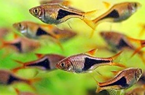 The harlequin rasbora (Trigonostigma heteromorpha) is a small fish in the family Cyprinidae. The harlequin rasbora is a fish that has an approximately lozenge-shaped body, whose basal colour from the head to the caudal peduncle is an orange-pink, the exact hue varying depending upon such factors as water conditions and the original population from which the fish was obtained.The harlequin rasbora is a shoaling fish,and should be kept in a group comprising a minimum of six individuals, though shoals of larger numbers are preferable not only from the standpoint of the well-being of the fish, but from an aesthetic standpoint.