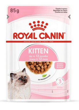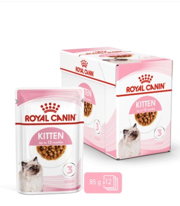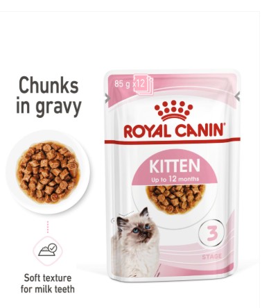 ROYAL CANIN® Kitten in Gravy is specially formulated to support the nutritional needs of kittens in the “consolidation phase” of their growth. This formula is suitable for 4 to 12-month-old kittens as they undergo a period of significant physical and behavioural changes. This tailored diet offers moist chunks in gravy that are an optimal size, texture and taste for growing kittens.It also contains nutrients such as Vitamin C and E to support the development of the kitten’s healthy immune system.
